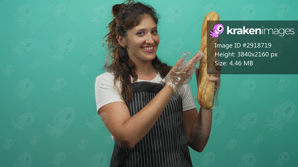 Woman holding a long baguette and pointing to the bread while wearing disposable gloves and a striped apron in a teal studio; friendly freshness service. - Kraken Images