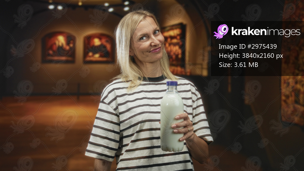 Woman holding a milk bottle with blue cap, hand visible and smiling, wearing a striped shirt in an art gallery building; serenity.