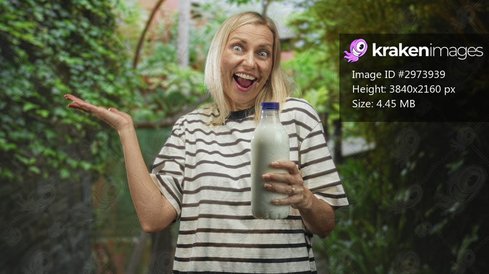 Woman holding a milk bottle with blue cap, smiling and waving hand, wearing striped shirt in a forest path beside brick wall and vines; cheerful surprise. - Kraken Images