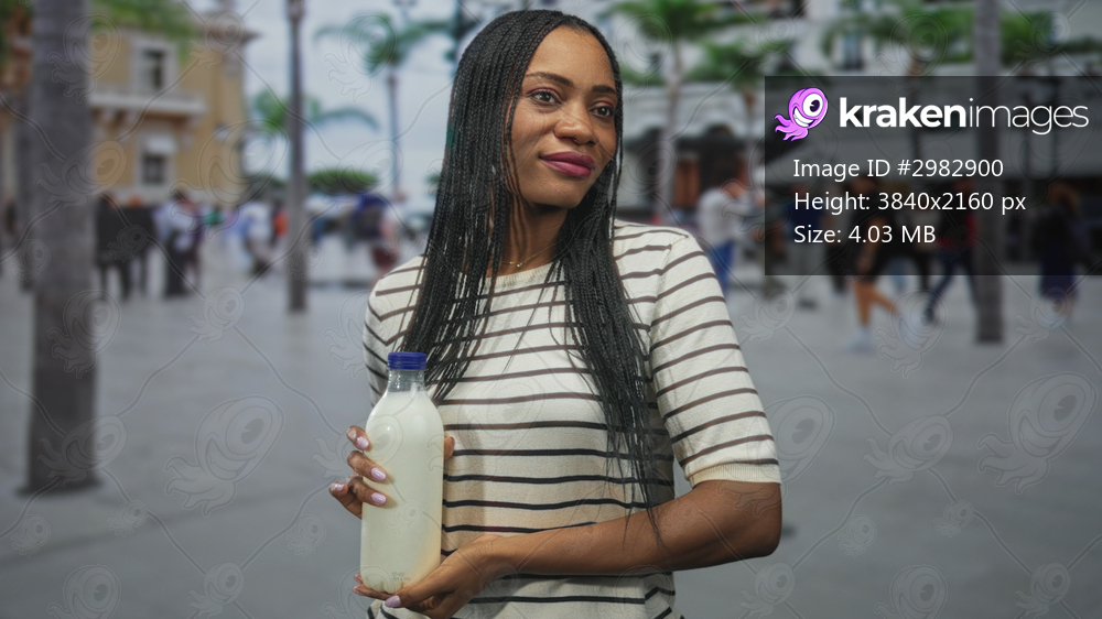 Woman holding a milk bottle with both hands, fingers visible, standing in a busy street plaza with palm trees; confidence.