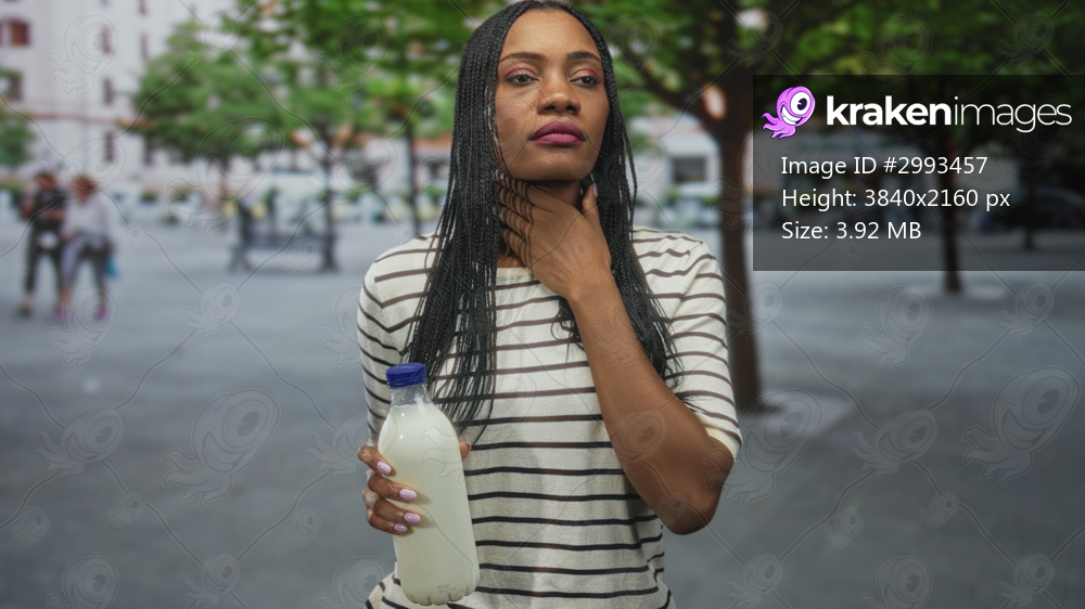 Woman holding a milk bottle by the cap with one hand, touching cheek and neck with the other, striped shirt and braids visible on a street plaza; quiet contemplation. - Kraken Images