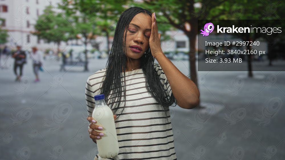 Woman holding a milk bottle by the cap with one hand, touching cheek and neck with the other, striped shirt and braids visible on a street plaza; quiet contemplation. - Kraken Images