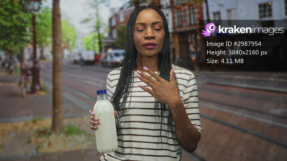 Woman holding a milk bottle and gesturing with manicured hand near chest on a city street; confidence self care.