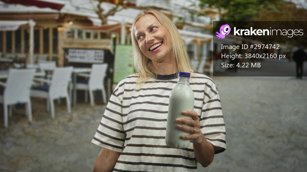 Woman holding a milk bottle in her bare hand on a busy street cafe, smiling toward camera while presenting the bottle; everyday happiness.