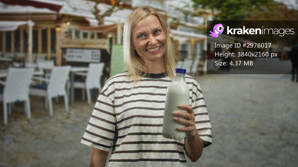 Woman holding a milk bottle in her bare hand on a busy street cafe, smiling toward camera while presenting the bottle; everyday happiness.