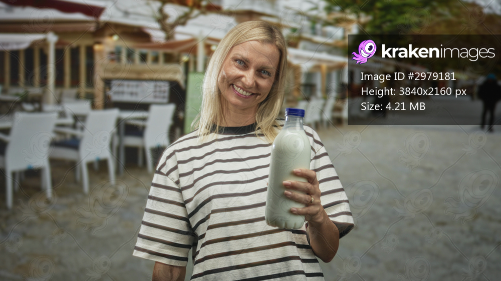 Woman holding a milk bottle in her bare hand on a busy street cafe, smiling toward camera while presenting the bottle; everyday happiness.
