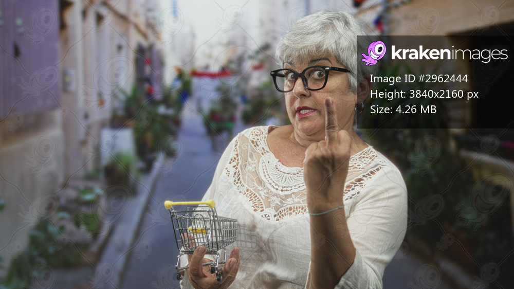 Woman holding a miniature shopping cart and gesturing with hands while speaking on a narrow cobbled street lined with plants; decision surprise.