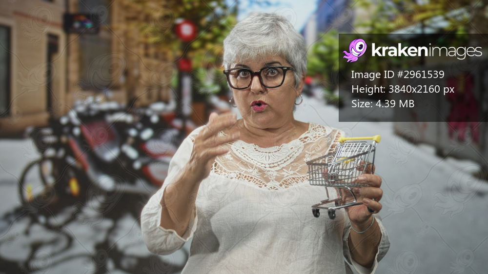 Woman holding a miniature shopping cart and gesturing with raised hand on a busy urban street; consumer frustration.