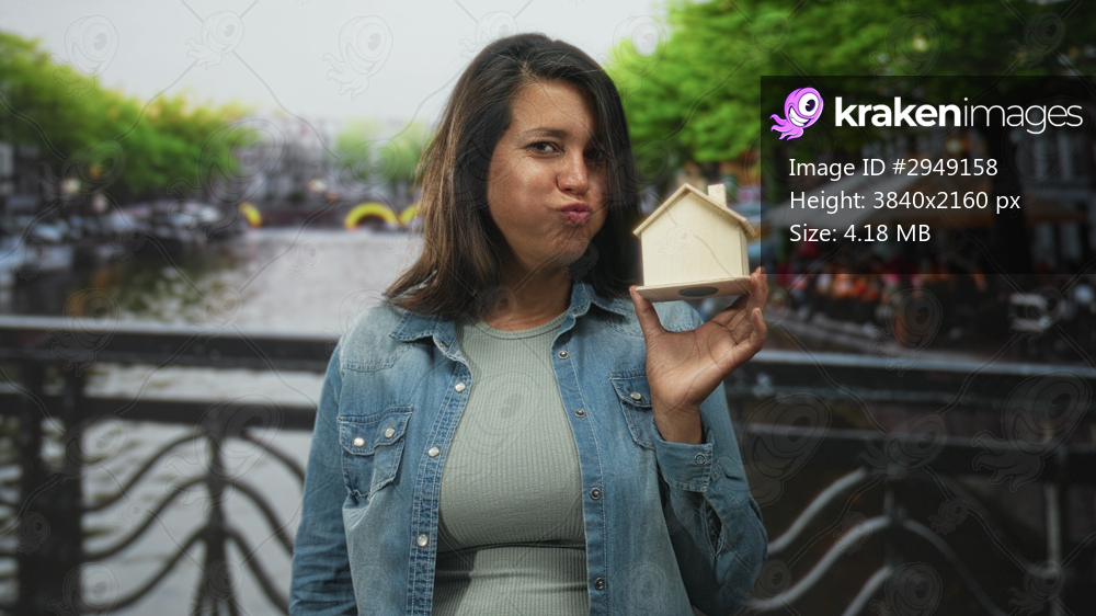 Woman holding a miniature wooden house, cheek puffed in a playful pout, wearing denim jacket and standing on a canal bridge near a cafe; playful optimism. - Kraken Images