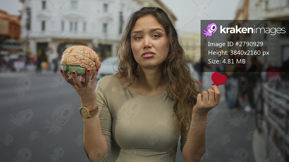 Woman holding a model brain and paper heart stands on a busy street, illustrating a choice between intellect and emotion in an urban outdoor setting.