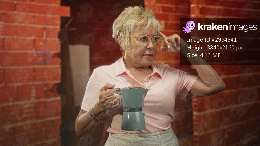 Woman holding a moka pot points finger to temple in studio with exposed brick wall, wearing glasses and pink polo; thoughtful reflection.