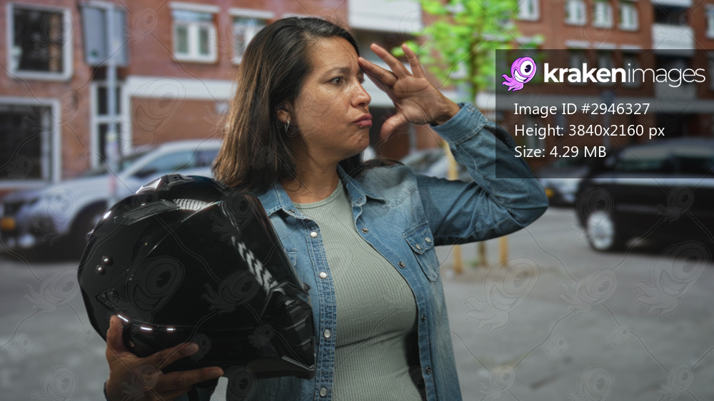 Woman holding a motorcycle helmet and shielding her eyes with a hand on a busy street lined with brick apartment buildings and parked cars; quiet contemplation. - Kraken Images