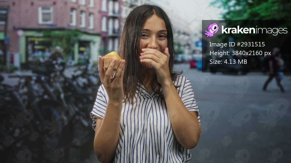 Woman holding a muffin and covering her mouth with one hand on a bustling city street lined with bicycles and buildings; delight.