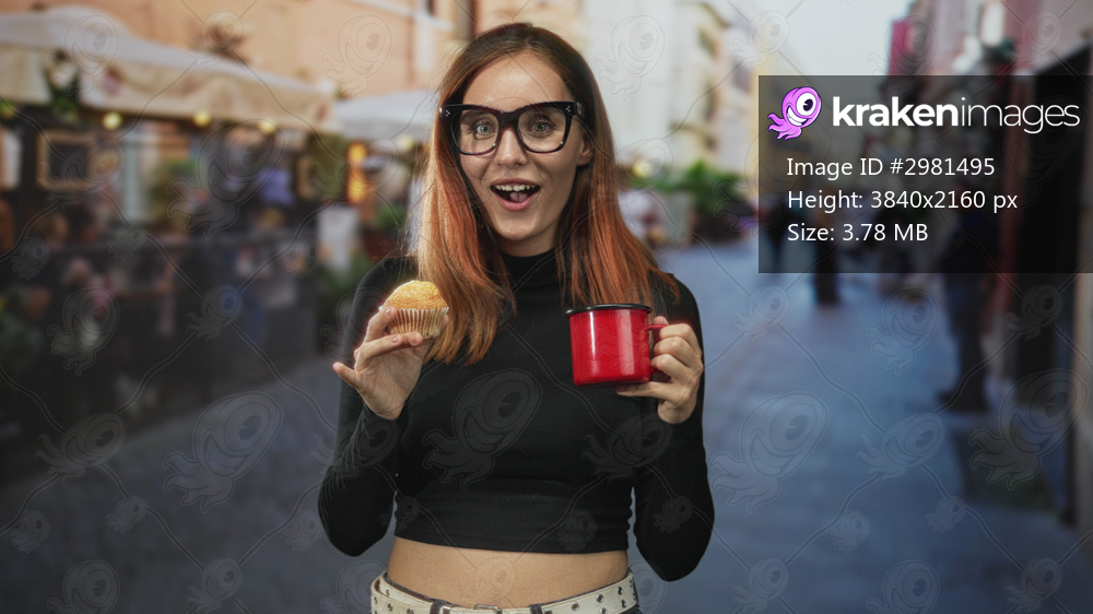 Woman holding a muffin in one hand and a red enamel mug in the other on a narrow street, wearing glasses and a black cropped top; cheerful morning.