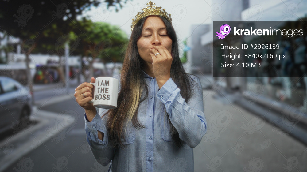 Woman holding a mug that reads i am the boss and finger to lips on a city street wearing a gold crown and casual shirt; confidence empowerment.