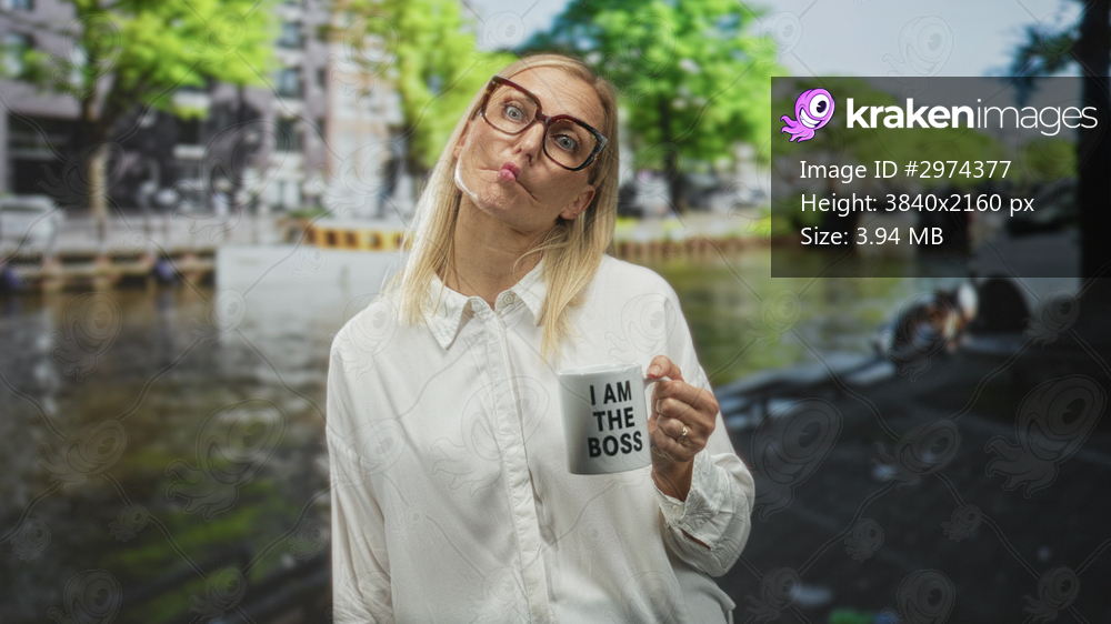 Woman holding a mug that reads i am the boss, tilting head and pursing lips while smirking on a street; confident humor.