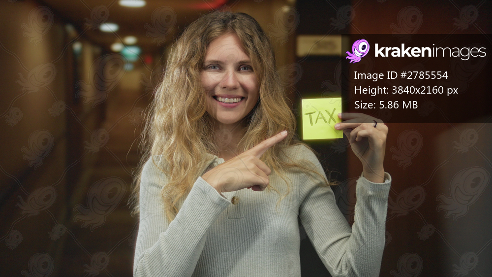 Woman holding a note while pointing into a hallway past her blonde young silhouette, smiling beside a tax message on a sticky sign in the hotel.