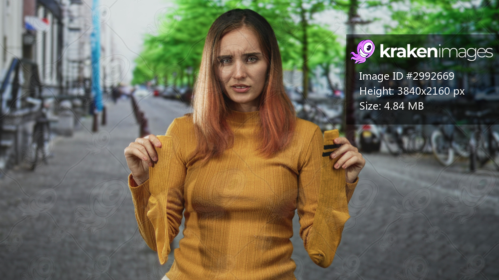 Woman holding a pair of yellow socks at shoulder height, frowning with knitted eyebrows and slightly hunched posture on a bike lined cobblestone street; frustration. - Kraken Images