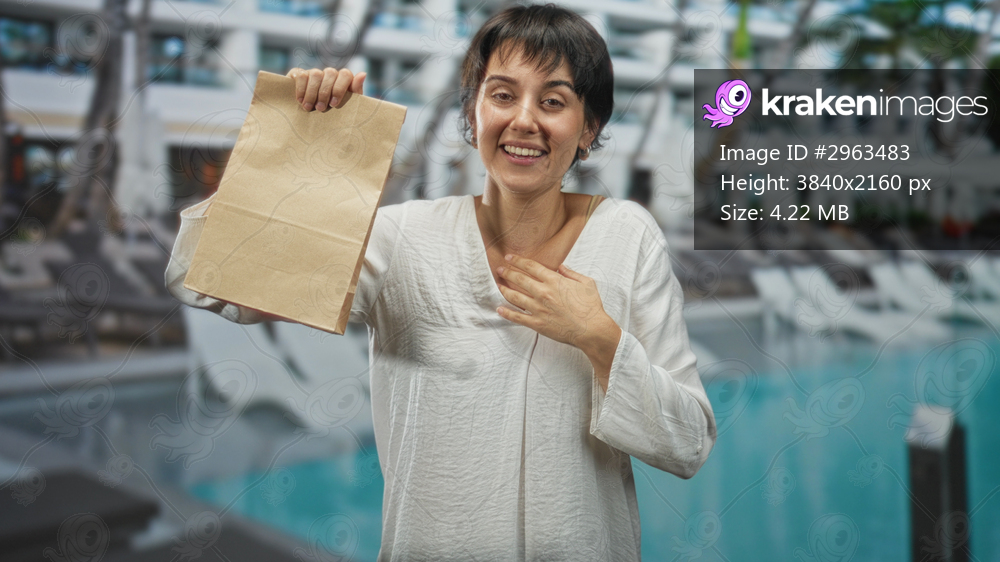 Woman holding a paper bag with one hand raised and the other hand on her chest, smiling by a hotel pool in building setting; surprise gratitude.