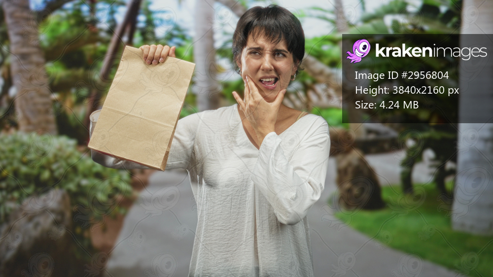 Woman holding a paper bag with one hand and touching her cheek for toothache on a street lined with palm trees and pathway; discomfort concern.