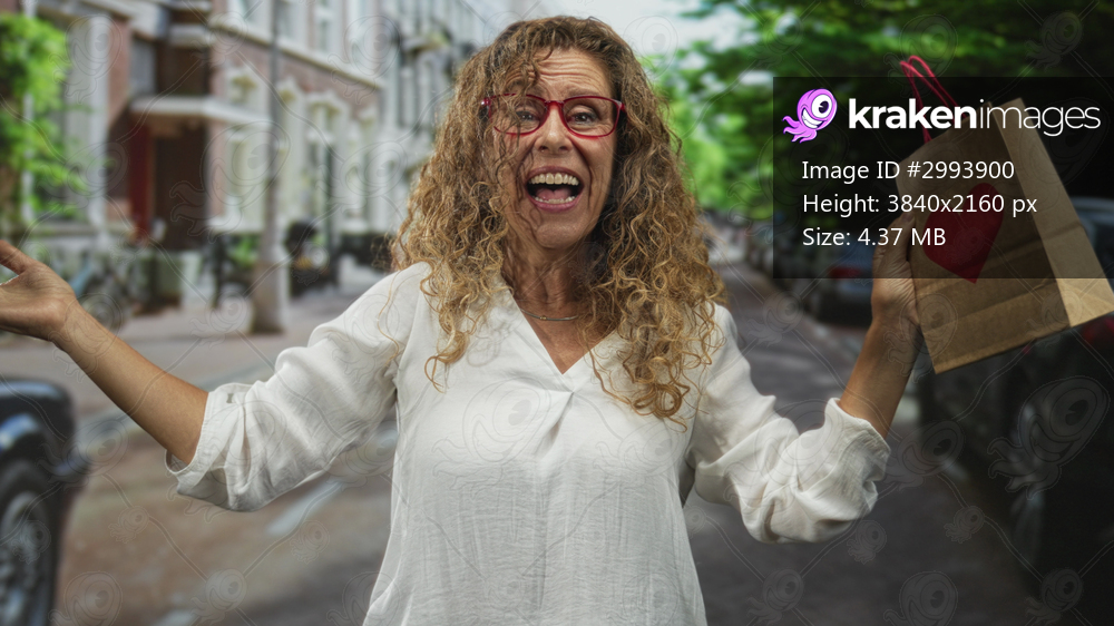 Woman holding a paper gift bag with raised hands and smiling on street, red glasses visible; joyful celebration.