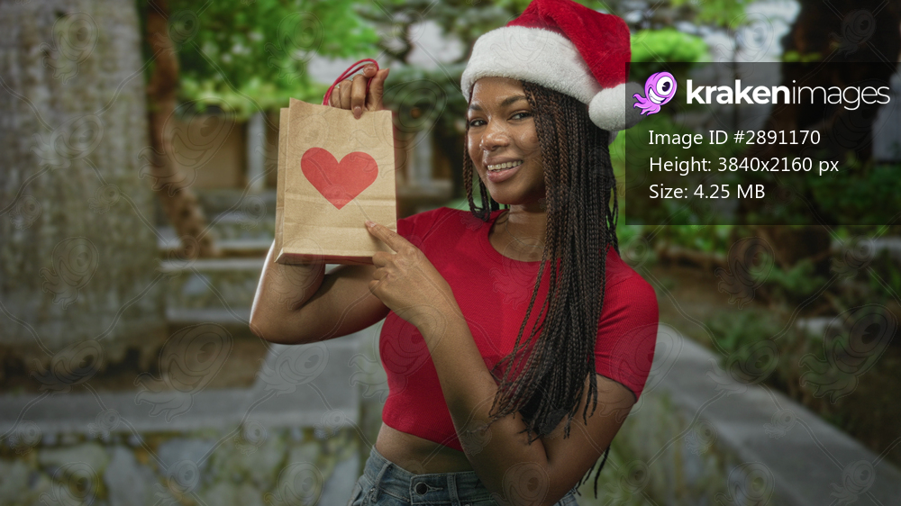 Woman holding a paper gift bag with red heart, wearing santa hat and smiling while presenting the bag in a forest; holiday joy.