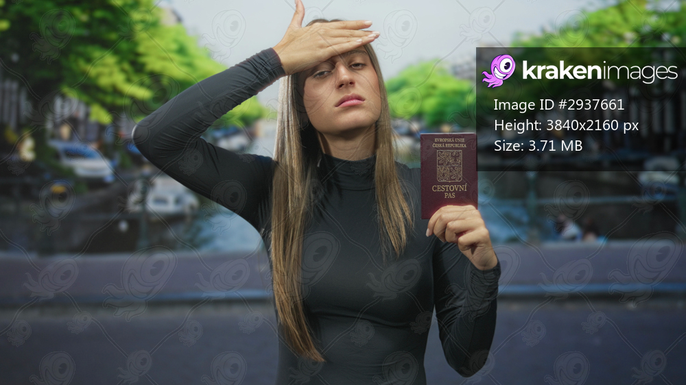 Woman holding a passport and hand on forehead on a city street by a canal bridge, showing passport forward; travel frustration.