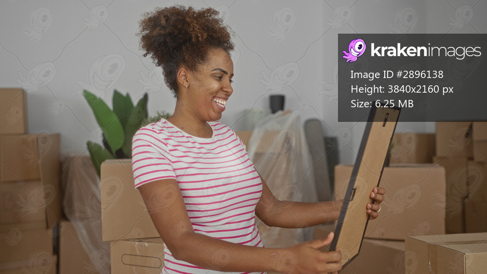Woman holding a picture frame, smiling with hands visible among stacked moving boxes inside a house; moving day joy.