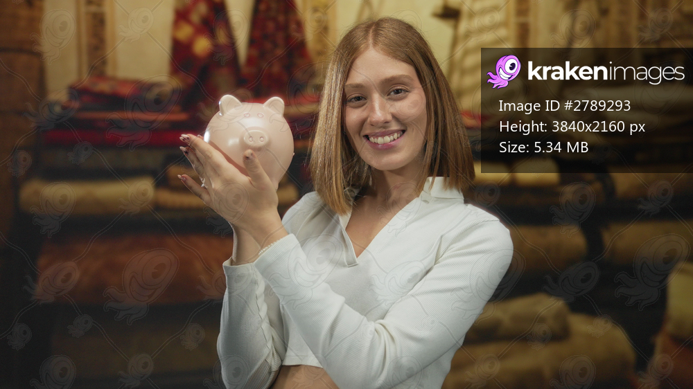 Woman holding a piggy bank with a smile, standing in a shop filled with rugs on a carpeted floor, showcasing saving and financial planning.