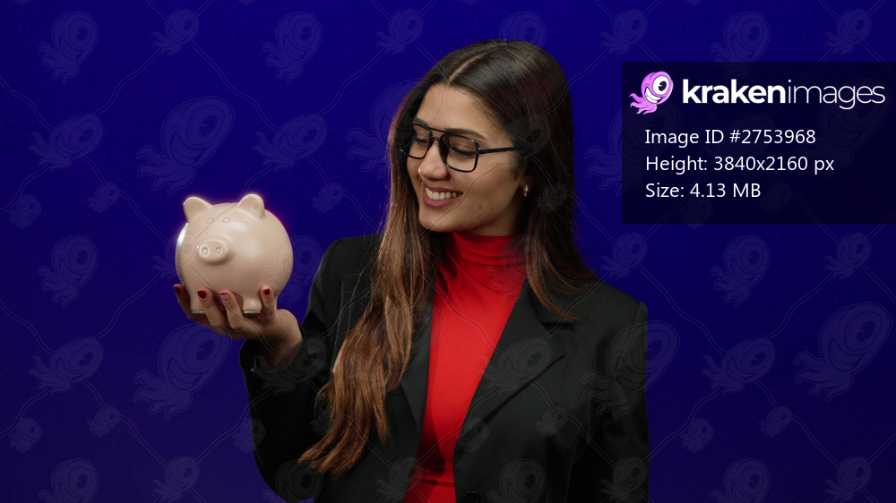 Woman holding a piggy bank against a blue background, showcasing savings and finance concepts with a smile, emphasizing business attire and hispanic ethnicity in an isolated setting. - Kraken Images