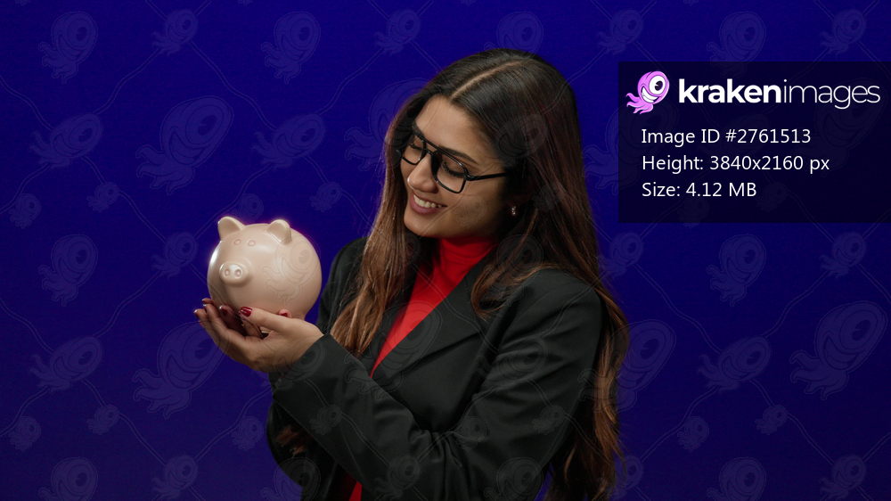Woman holding a piggy bank against a blue background, showcasing savings and finance concepts with a smile, emphasizing business attire and hispanic ethnicity in an isolated setting. - Kraken Images