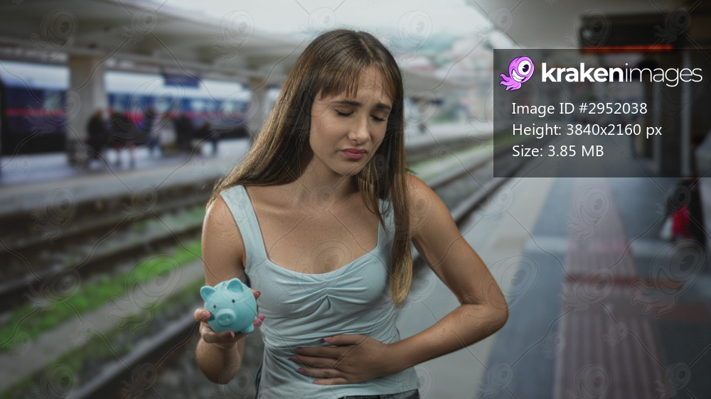 Woman holding a piggy bank and clutching her stomach at a train building platform; financial anxiety.