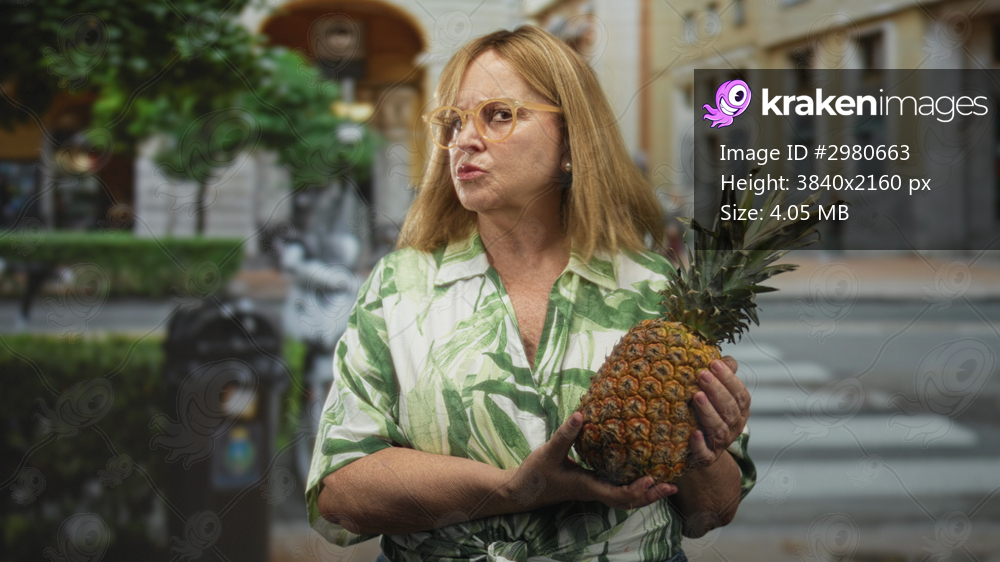 Woman holding a pineapple with both hands at a street crosswalk wearing leaf print shirt and glasses; quirky amusement.