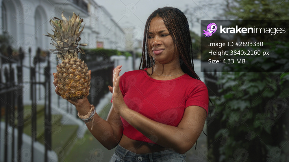 Woman holding a pineapple and finger pointing to pineapple while wincing on a residential street with iron railings and townhouse steps; disgust.