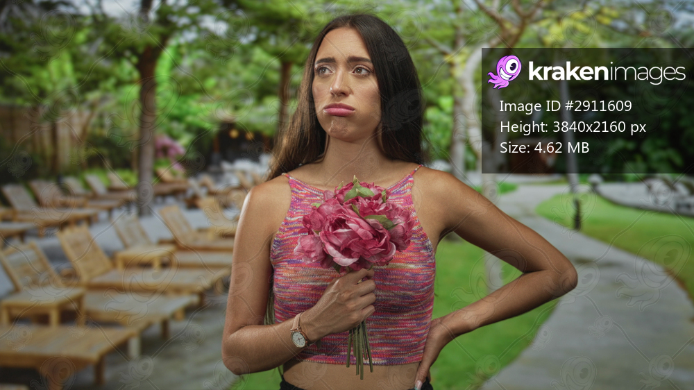Woman holding a pink bouquet and touching her neck while looking down in a forest park setting; melancholy longing.