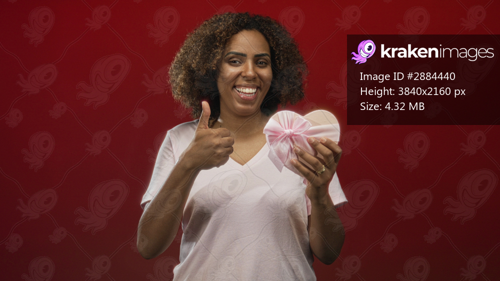 Woman holding a pink heart gift with hands while smiling and giving thumbs up in studio; joy gratitude love.