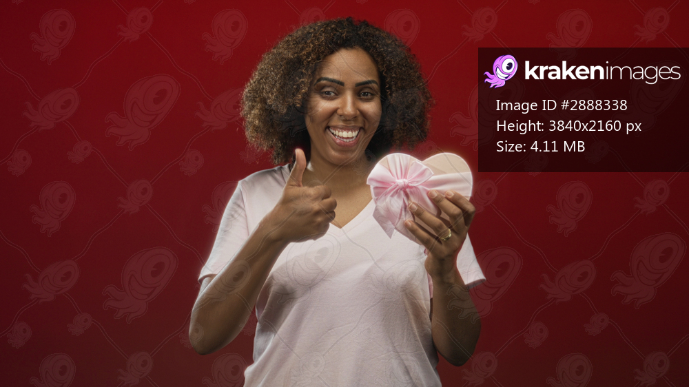Woman holding a pink heart gift with hands while smiling and giving thumbs up in studio; joy gratitude love.