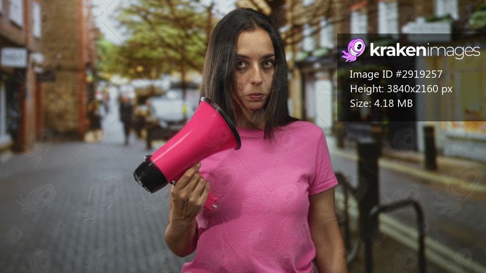 Woman holding a pink megaphone on street, looking down at the device and gripping handle in a quiet protest posture; determination protest activism.