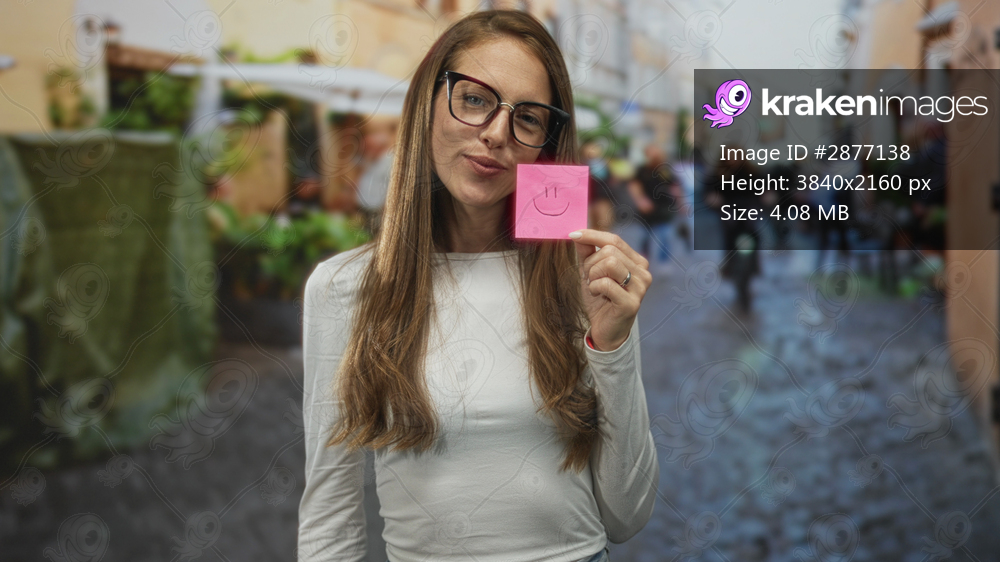 Woman holding a pink sticky note with a smiley over one eye on a busy cobblestone street while wearing glasses and a white long sleeve shirt; playful confidence. - Kraken Images