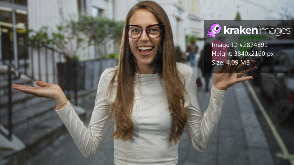 Woman holding a pink sticky note with a smiley while showing open hands and wearing glasses on a city street; joy spontaneity.