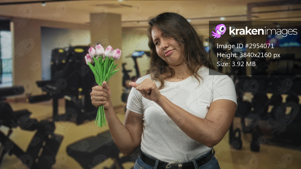 Woman holding a pink tulip bouquet and pointing her thumb at the flowers in a gym building with an unimpressed face; playful doubt.
