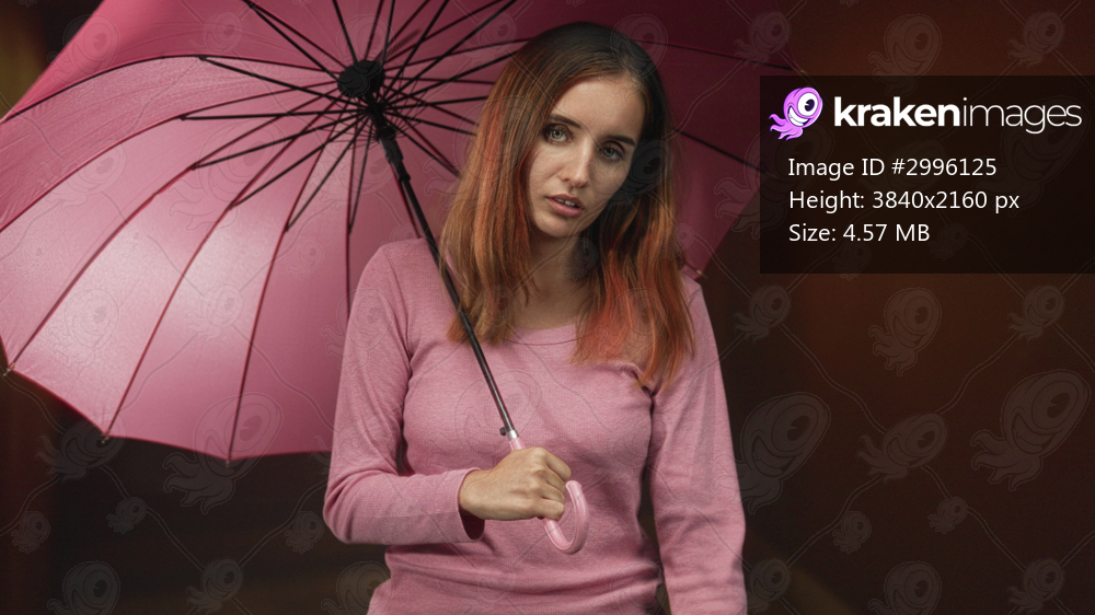 Woman holding a pink umbrella and firmly gripping the handle while staring forward in studio; uncertainty.