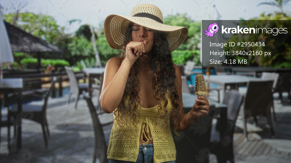 Woman holding a popsicle with hand to chest at building patio under bright sunlight, yellow crochet vest visible; satisfaction summer leisure.