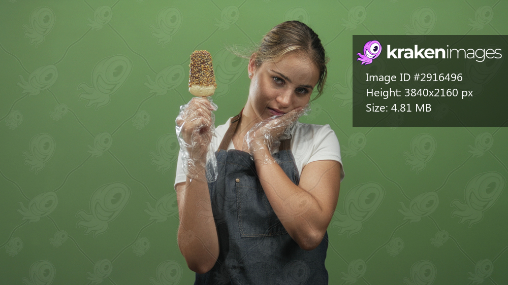 Woman holding a popsicle while wearing an apron and gloved hands in a green studio; thoughtful curiosity.