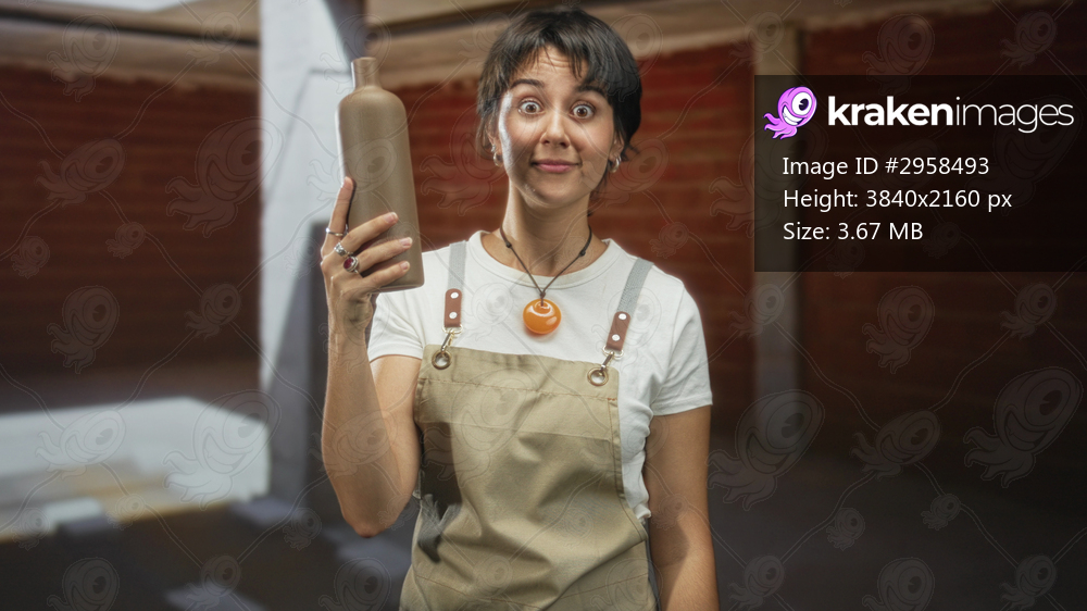 Woman holding a pottery bottle up in a studio, wearing an apron and white tee while smiling and displaying the ceramic piece with her hand; joy craft pride. - Kraken Images