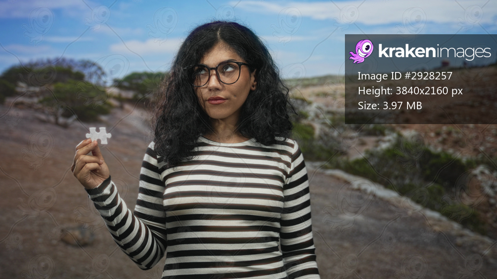 Woman holding a puzzle piece in her hand on a rocky street near scrubby trees, wearing striped top and round glasses; pensive reflection.