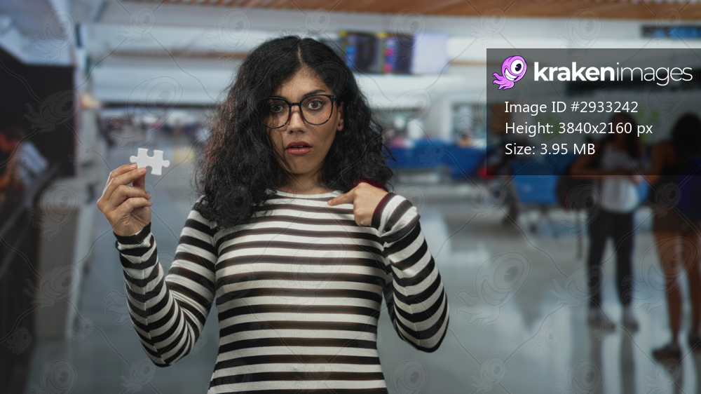 Woman holding a puzzle piece and pointing finger to chest in an airport terminal, striped shirt visible; confusion uncertainty travel stress.