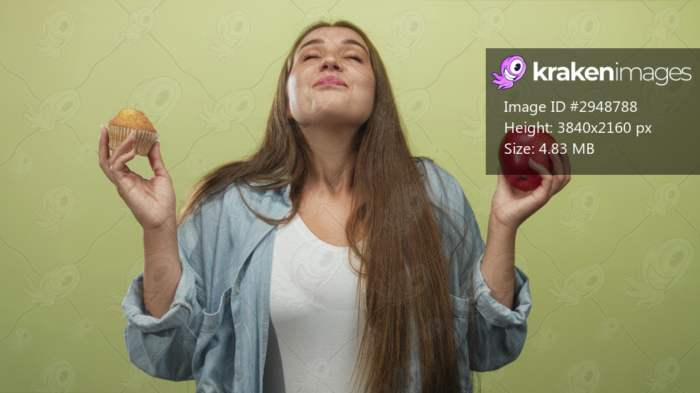Woman holding a red apple and a cupcake in a light green studio, glancing at the apple while comparing choices; choice indecision.