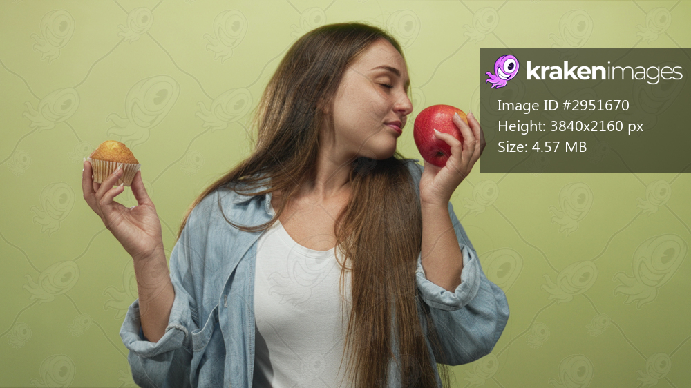Woman holding a red apple and a cupcake in a light green studio, glancing at the apple while comparing choices; choice indecision.