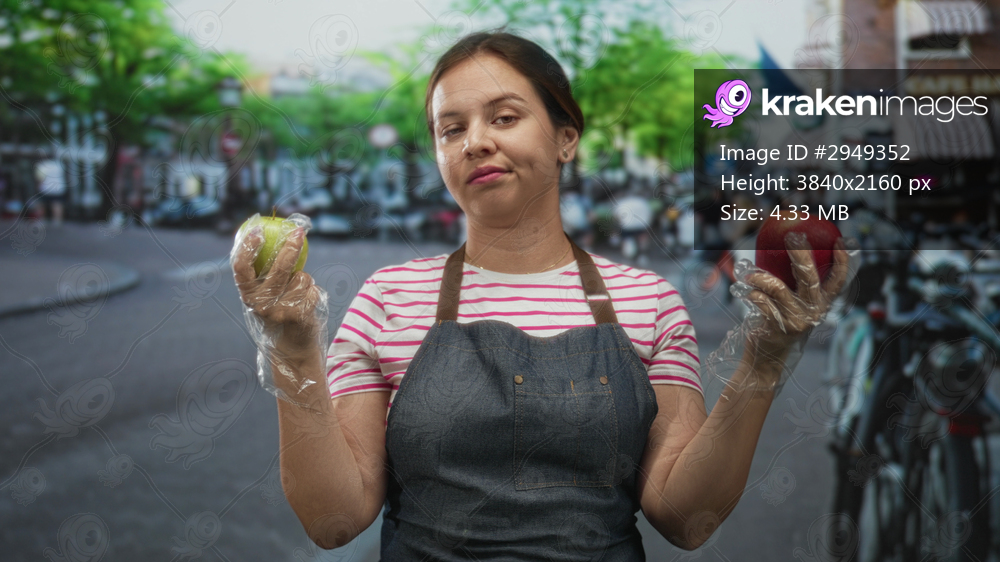 Woman holding a red apple and a green apple in plastic gloves on a busy city street; choice contemplation decision.